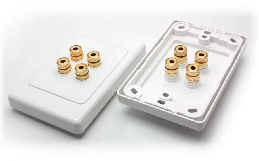 The 2 Speaker Hi-Fi Wall Plate is easier to use than peeling a banana. Simply insert your Banana Plug connector into the terminal or alternatively twist the speaker wire strands and secure them through the Binding Post screw-down connector! This 2 Speaker Hi-Fi Wall Plate has been specifically made for media room installations and is perfect for running cables through your walls, floor or roof cavities.