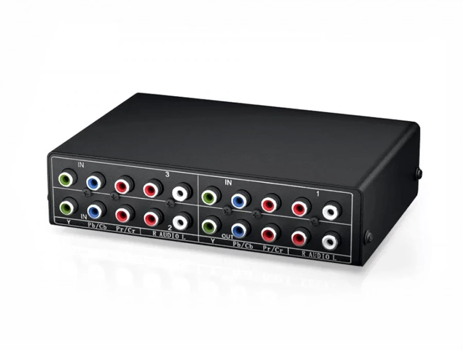 This Component Video switch offers three separate sets of analogue inputs, each including 3RCA Component Video plus 2RCA Stereo Audio. Each input can be paired up socket-for-socket to the output RCAs. This means that no signal conversion takes place, so please ensure your output device supports both audio formats if your source devices use a mixture of both.