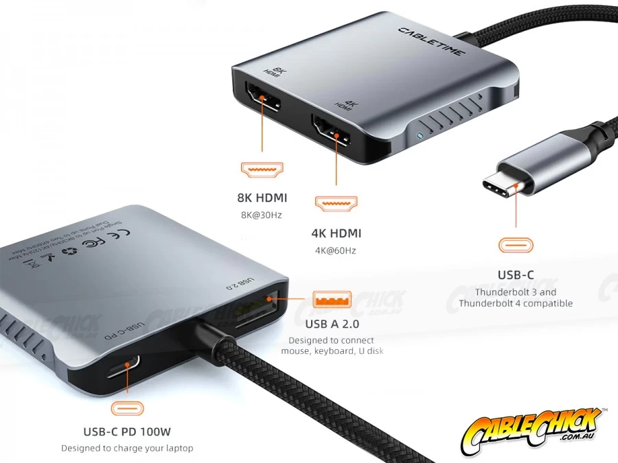Note: 8K@30hz resolution is only achievable when using just 1x HDMI port at a time. When using both HDMI ports the maximum resolution will be 4K@60Hz each, depending on the abilities of your connected USB-C port.