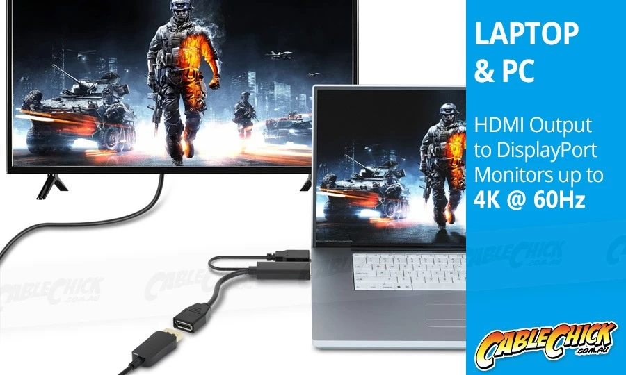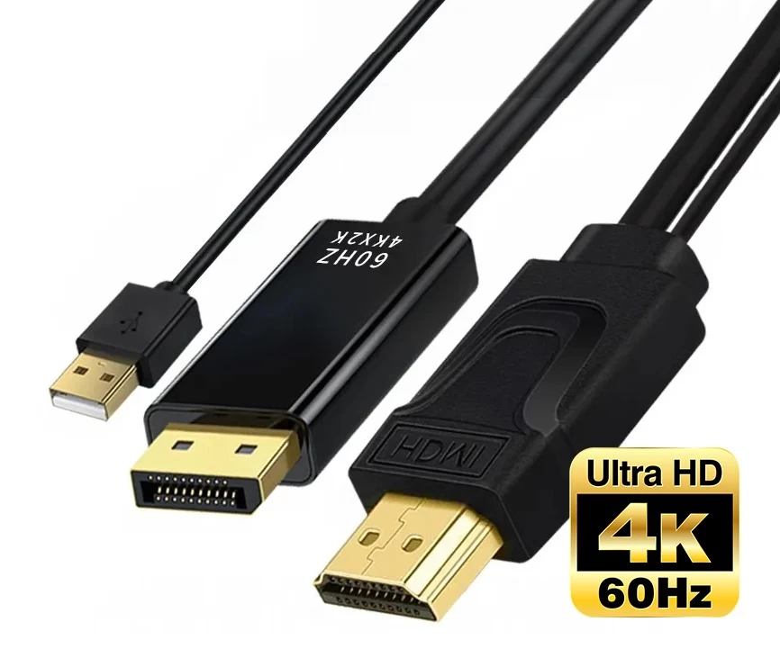 The converter cables terminate at male HDMI and USB plugs, with a small box housing the female DisplayPort socket at the other end. Use it with your own DisplayPort cable, or grab a length from us in our DisplayPort category.