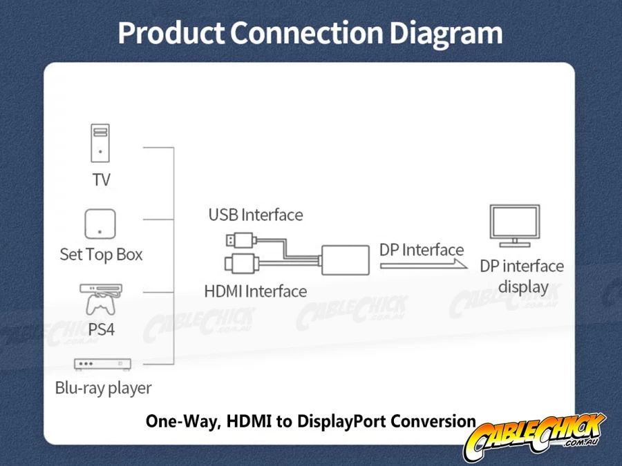 As an active (powered) device, an integrated USB cable is included and essential for operation. Simply attach it to any powered USB socket, either on your laptop, display, PC or USB wall charger (not included) and you’re good to go. This additional power runs the conversion hardware that processes the HDMI standard to DisplayPort standard. Note: Not compatible with VR headsets.
