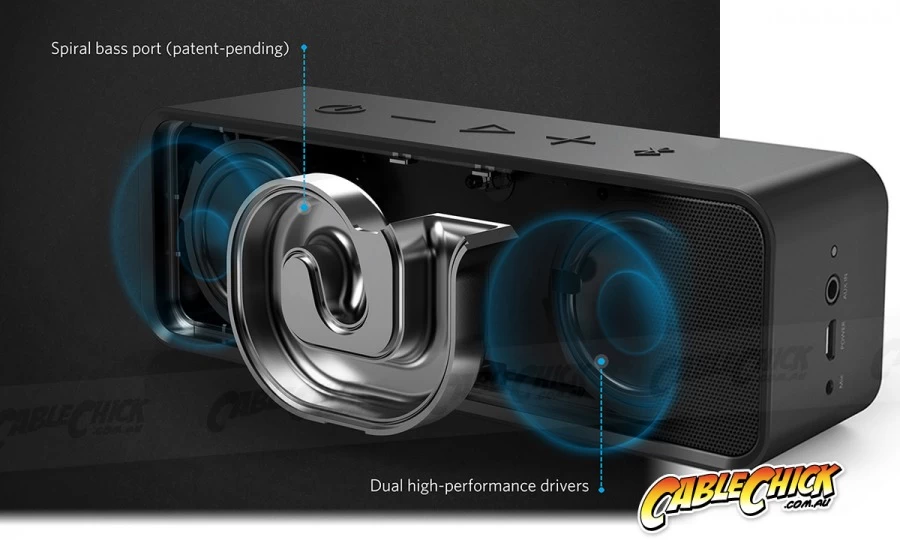 So, what’s the specs I hear you say. You get the dual-driver portable Bluetooth 4.0 speaker that’s enhanced by a spiral bass port, and its powered by a li-ion battery that’s good for up to 24 hours of playback. A Micro-USB charging cable is included, and the speaker features proper Bluetooth pairing with playback controls and even call answer function. Anker claim less than 1% total harmonic distortion!